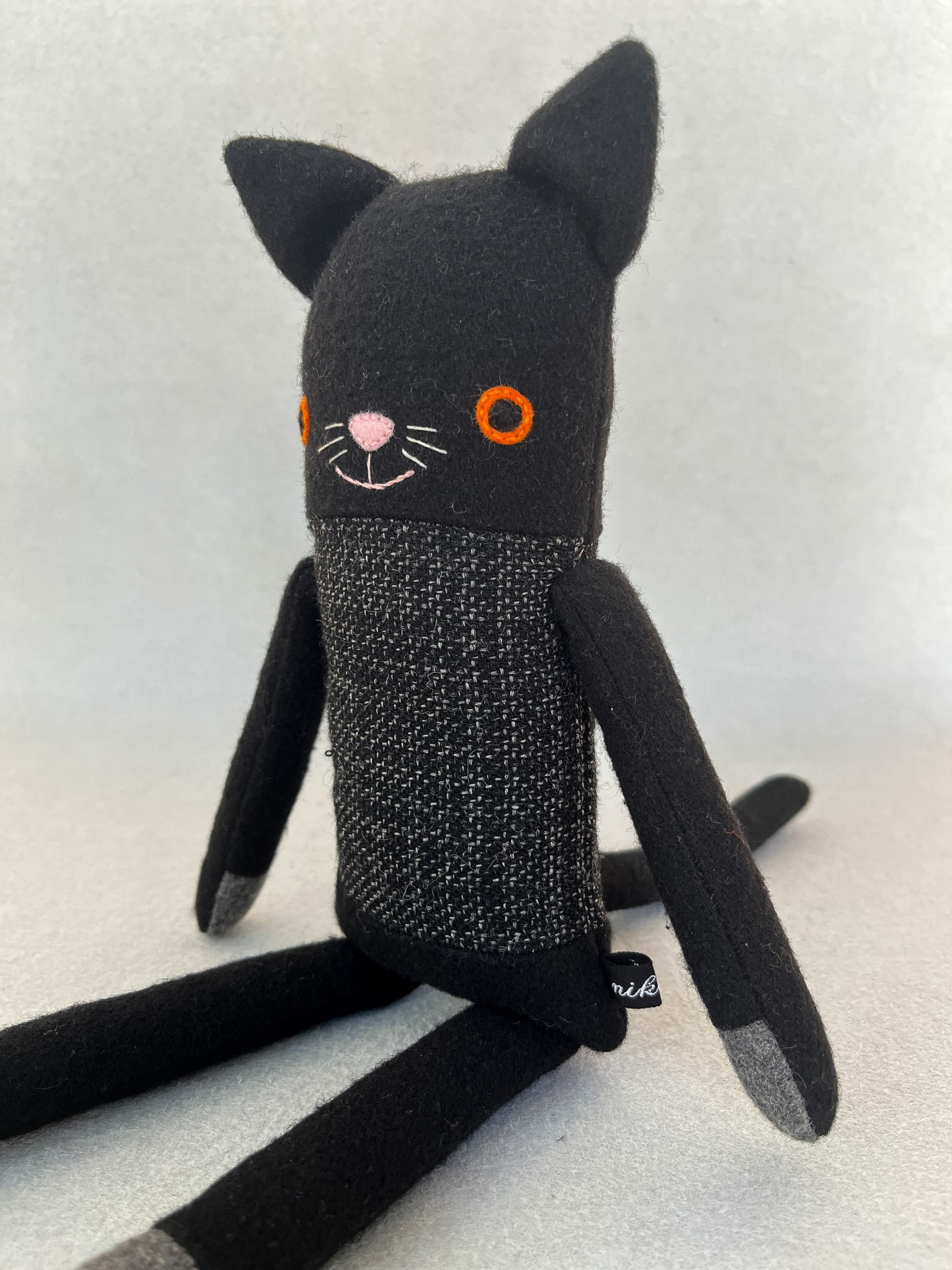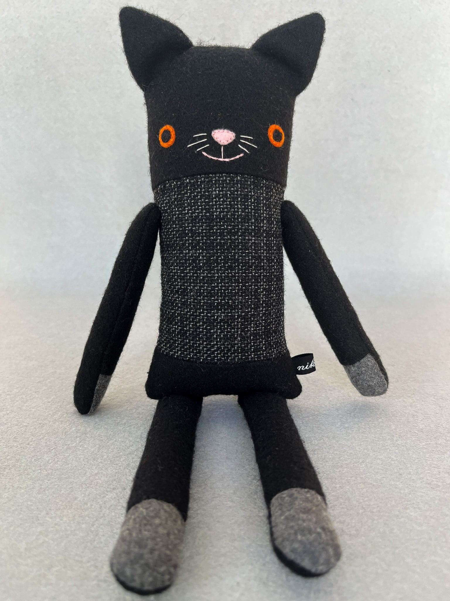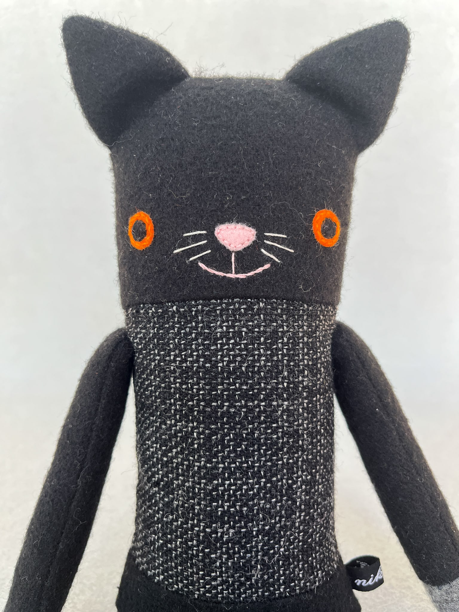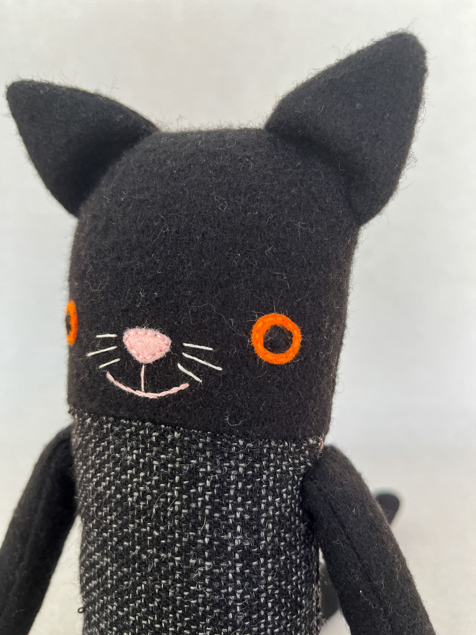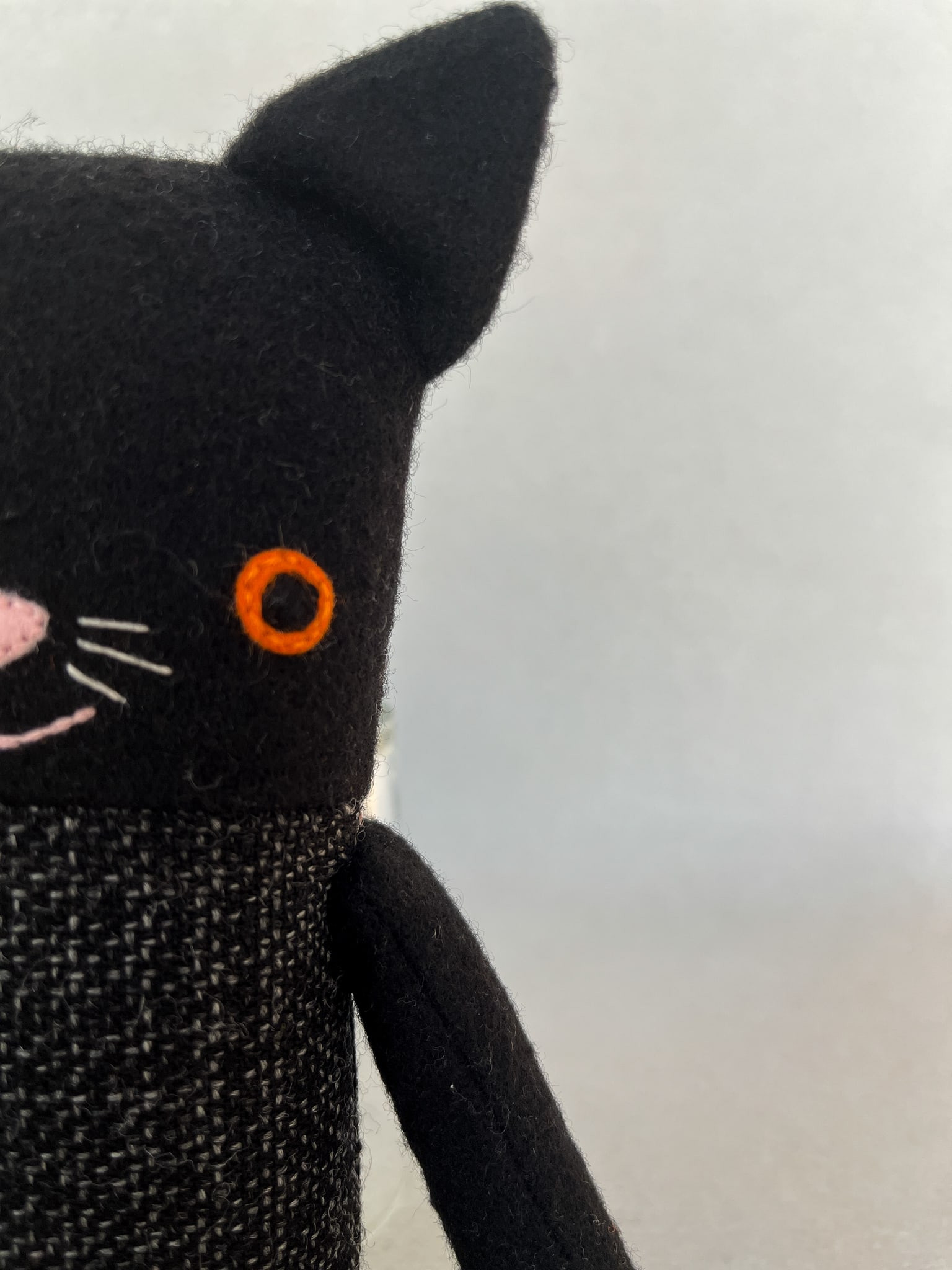 Hollie besteht aus Wolltweed, Baumwolle und Wollmischfilz. In Form gebracht mit Füllwatte, die mit dem Öko-Tex Standard 100 zertifiziert ist. Die Katze ist ca. ca. 32 cm groß. Hollies Gesicht wurde liebevoll appliziert und von Hand gestickt.