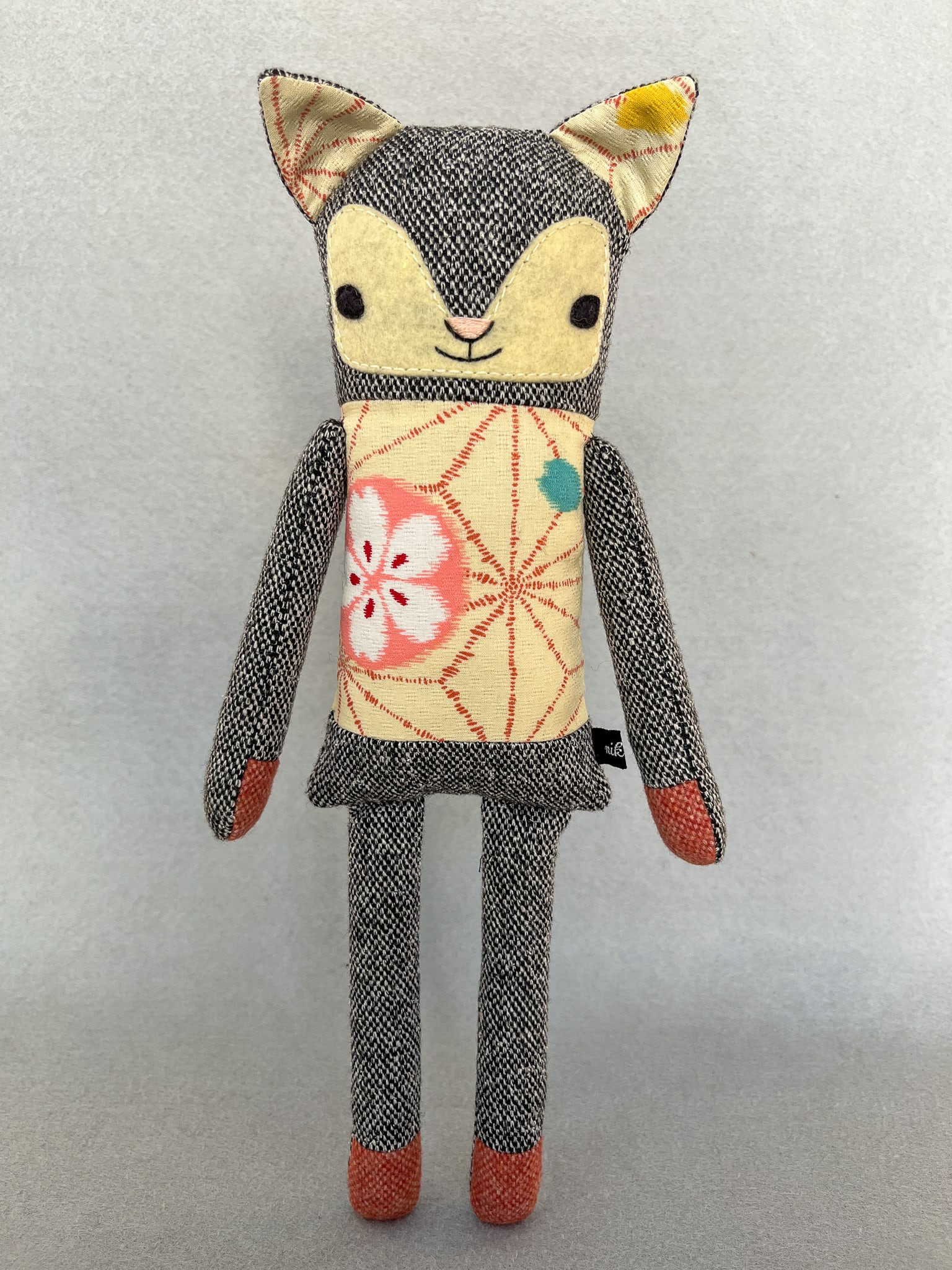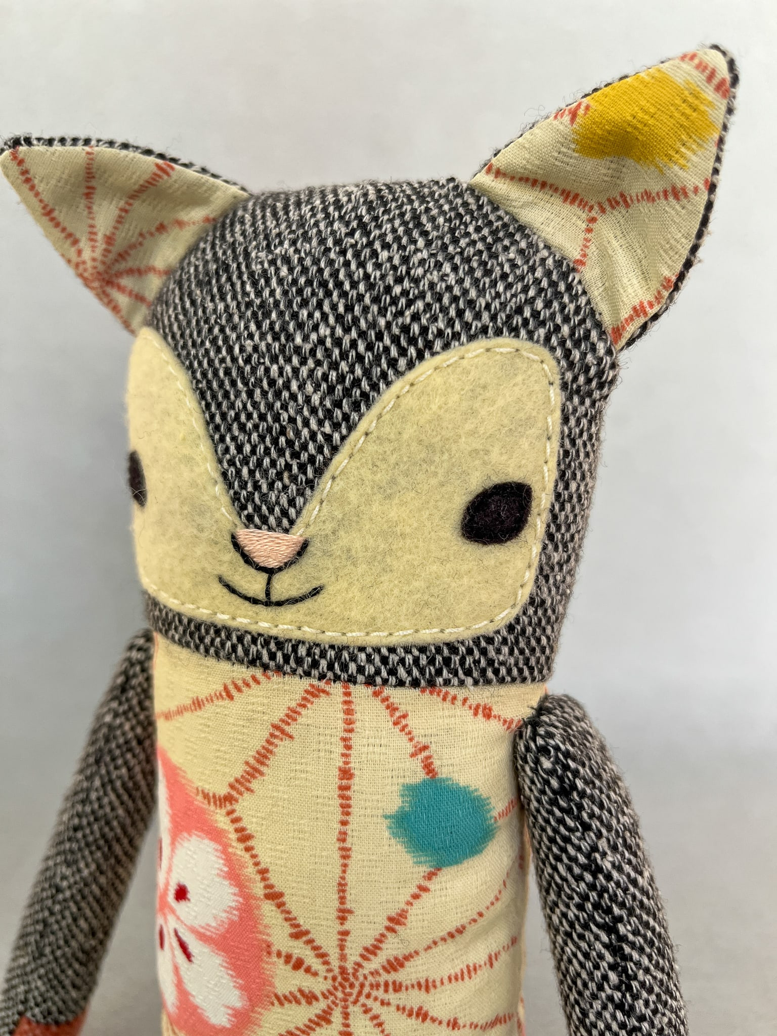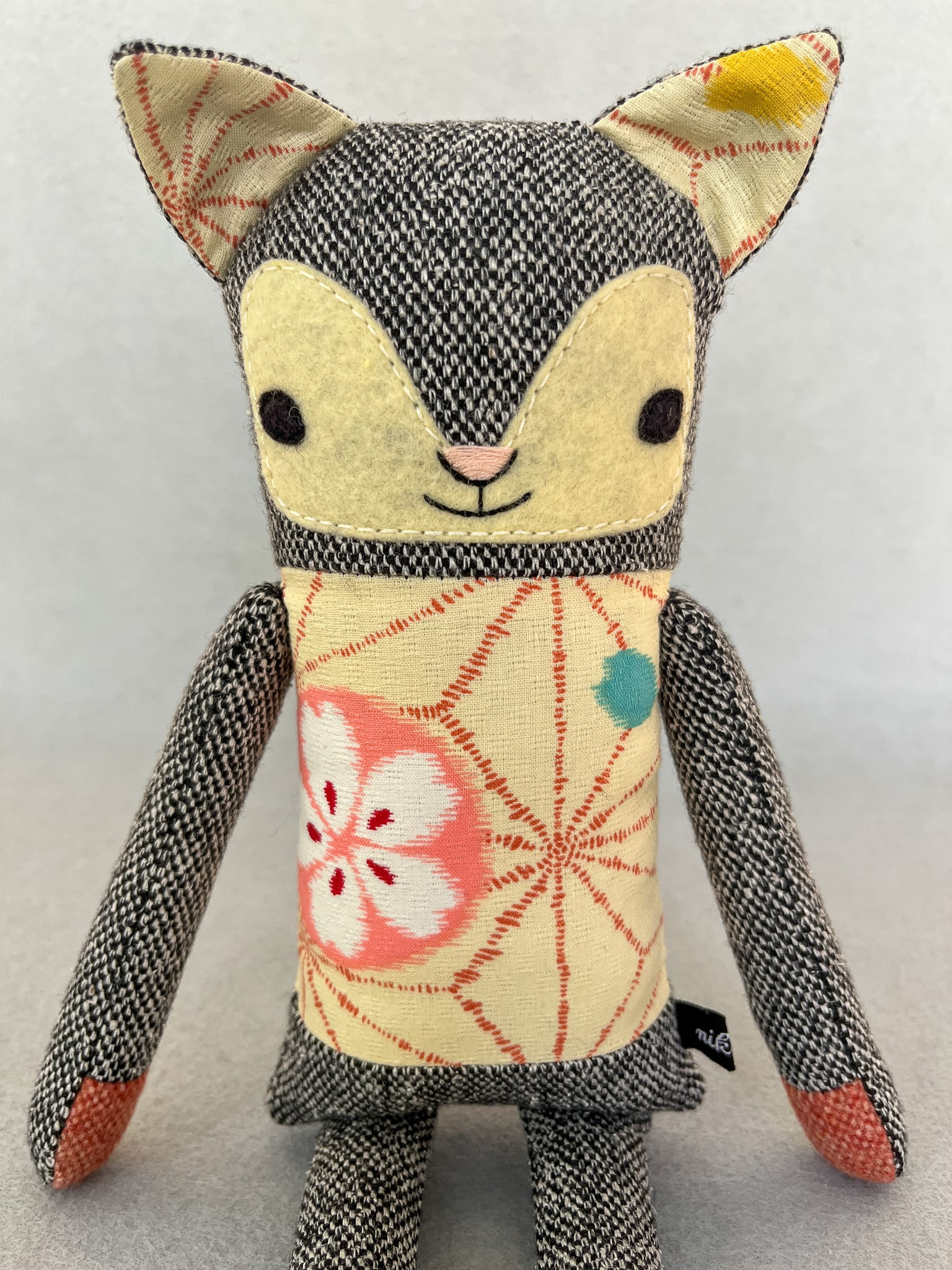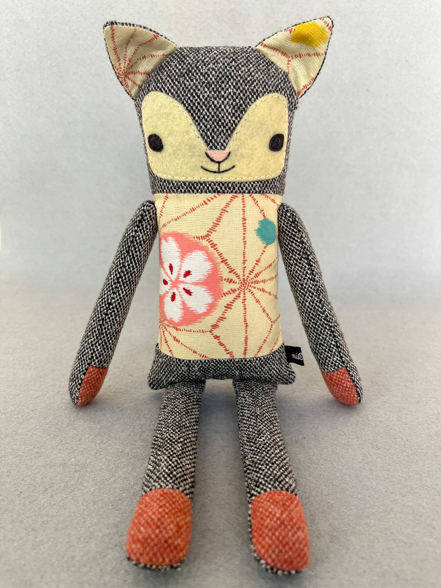 Michiko besteht aus Wolltweed, japanischer Baumwolle und Wollmischfilz. In Form gebracht mit Füllwatte, die mit dem Öko-Tex Standard 100 zertifiziert ist. Die Katze ist ca. 32 cm groß. Michikos Gesicht wurde liebevoll appliziert und von Hand gestickt.