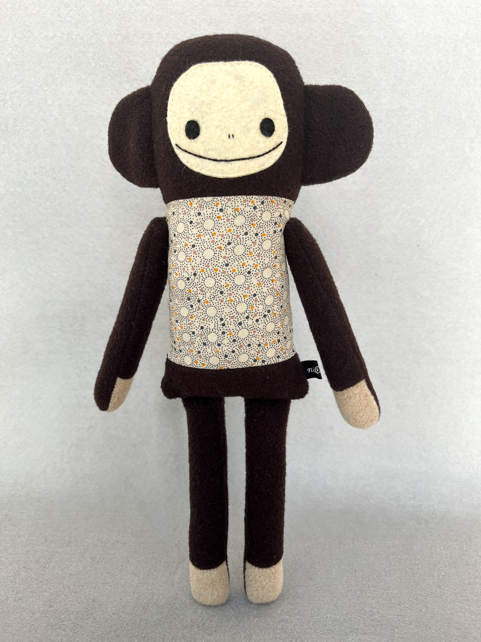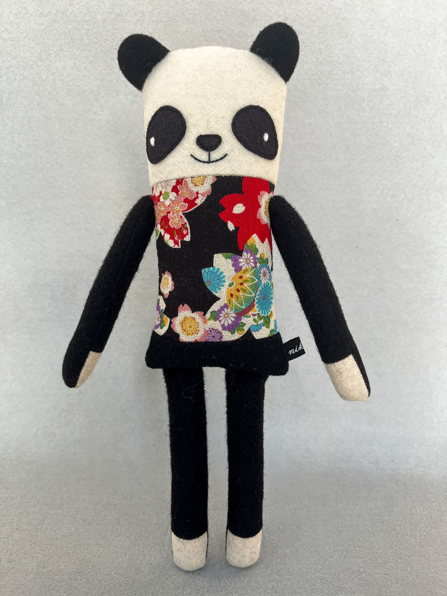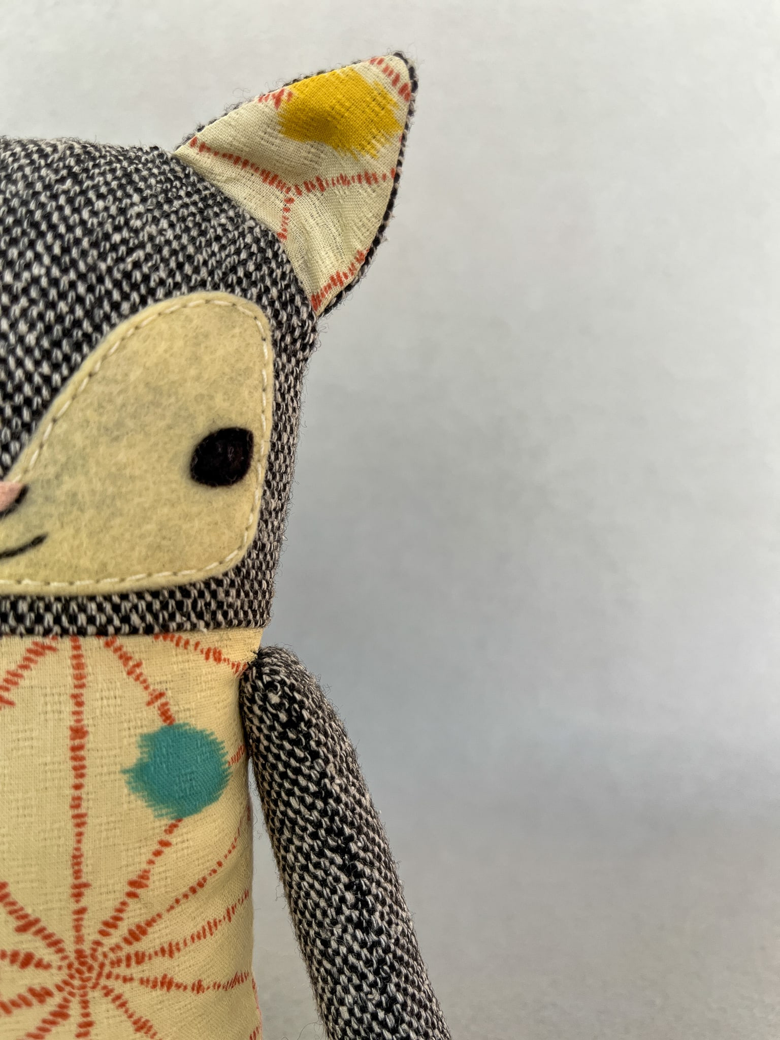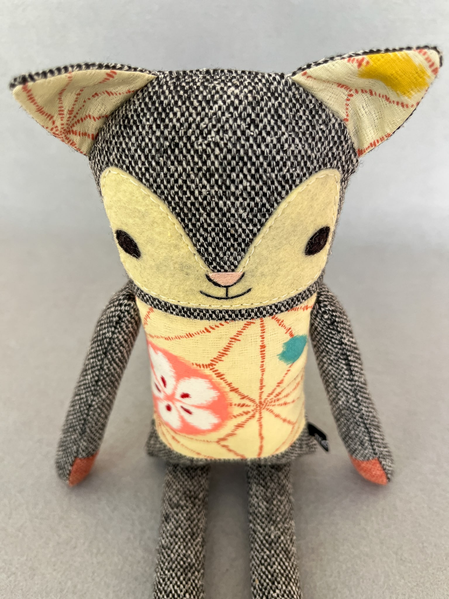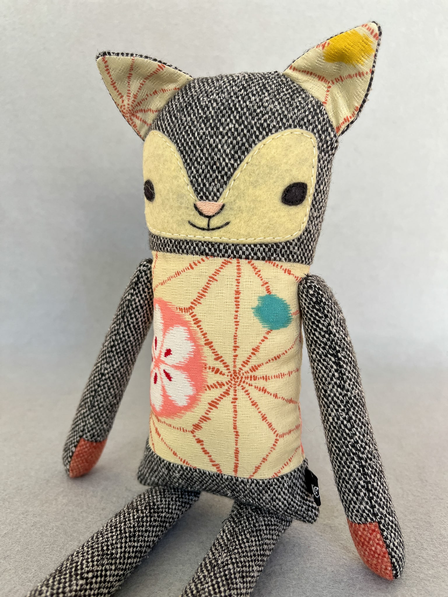 Michiko besteht aus Wolltweed, japanischer Baumwolle und Wollmischfilz. In Form gebracht mit Füllwatte, die mit dem Öko-Tex Standard 100 zertifiziert ist. Die Katze ist ca. 32 cm groß. Michikos Gesicht wurde liebevoll appliziert und von Hand gestickt.