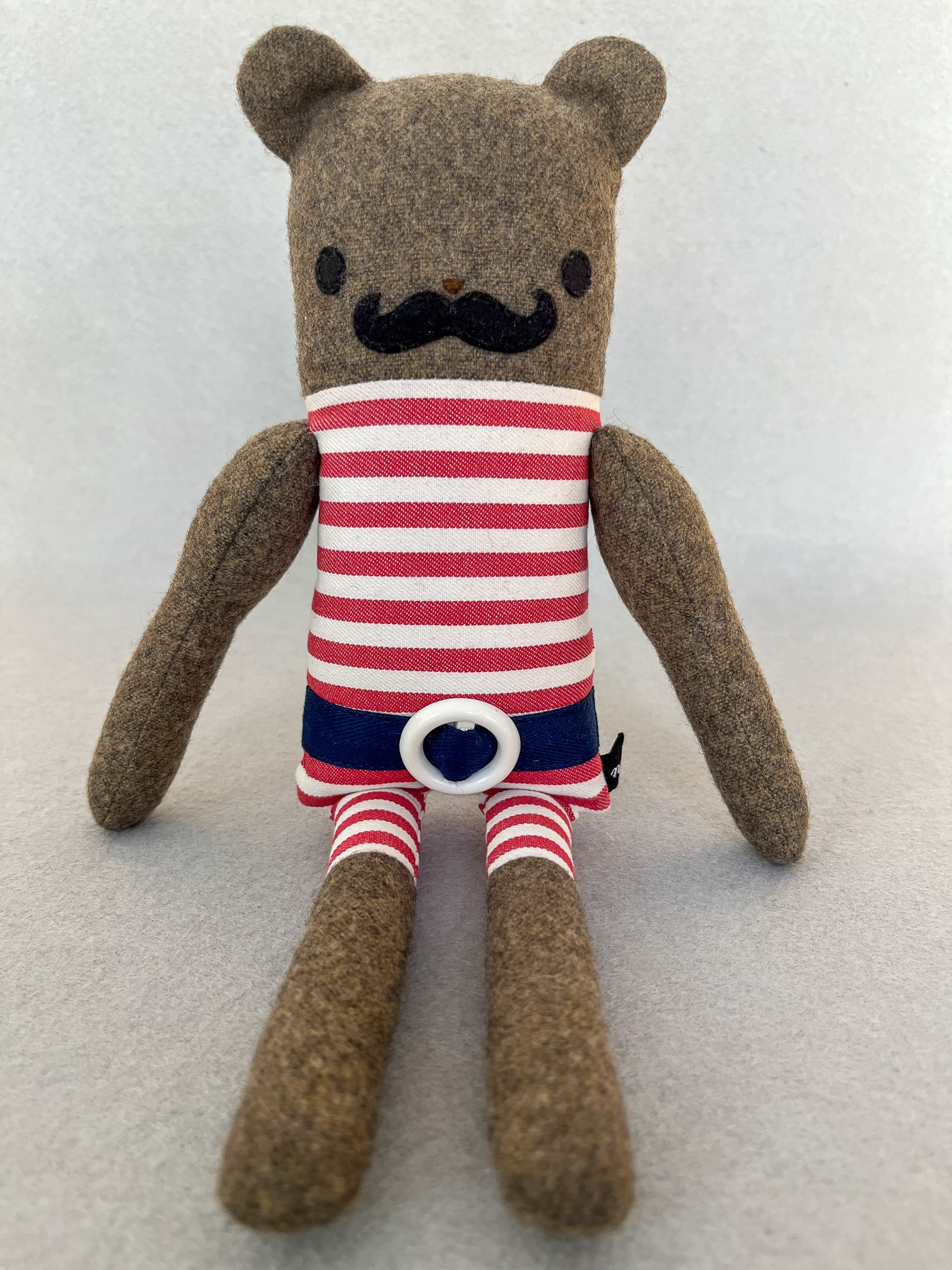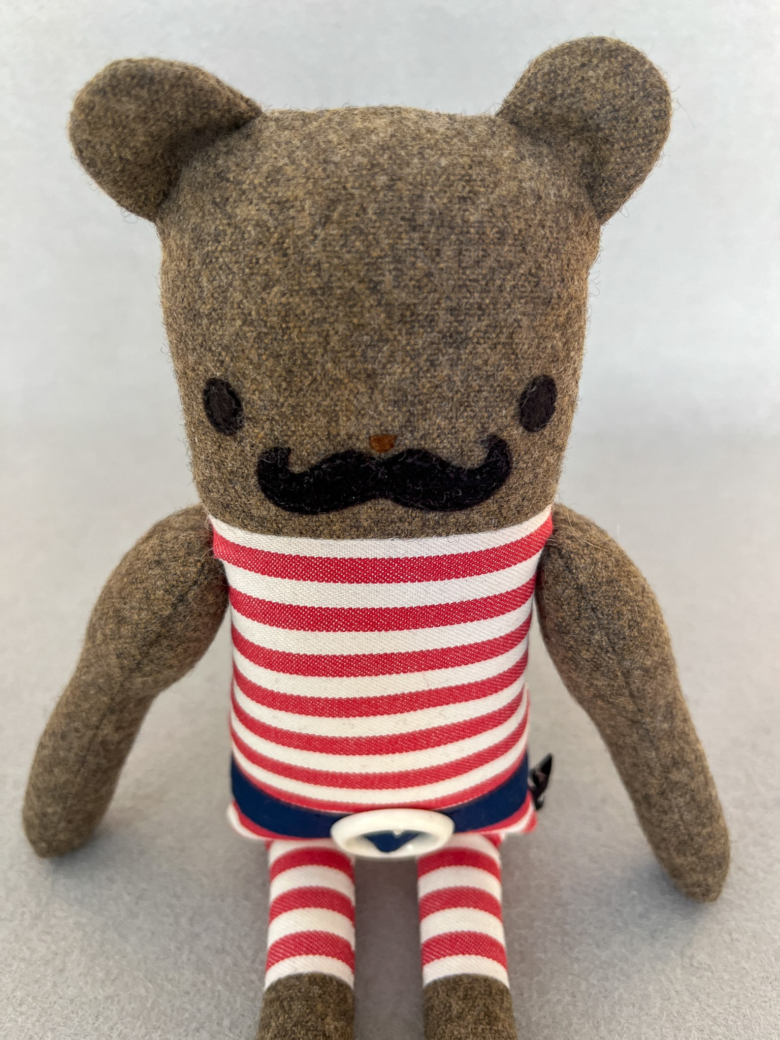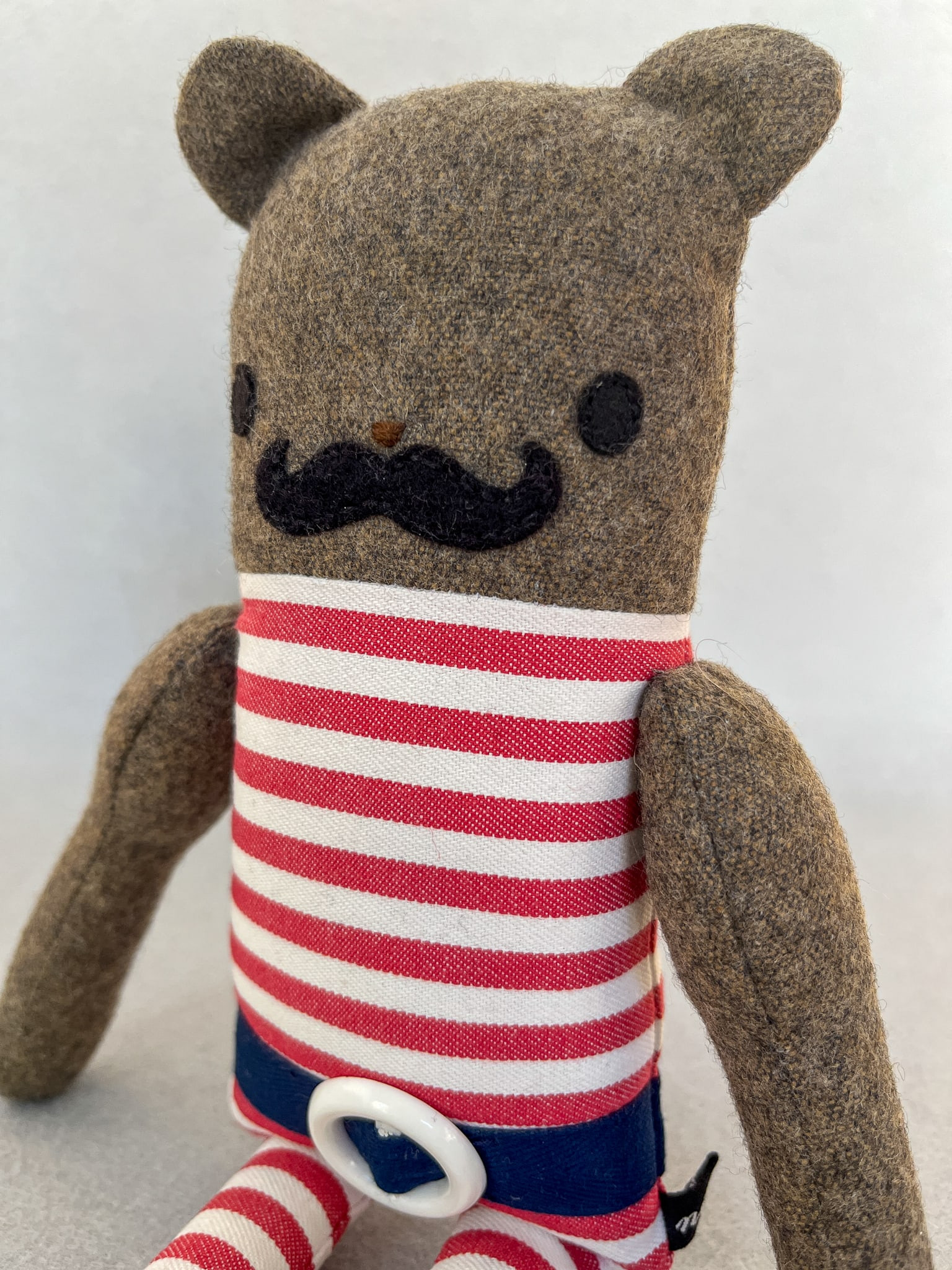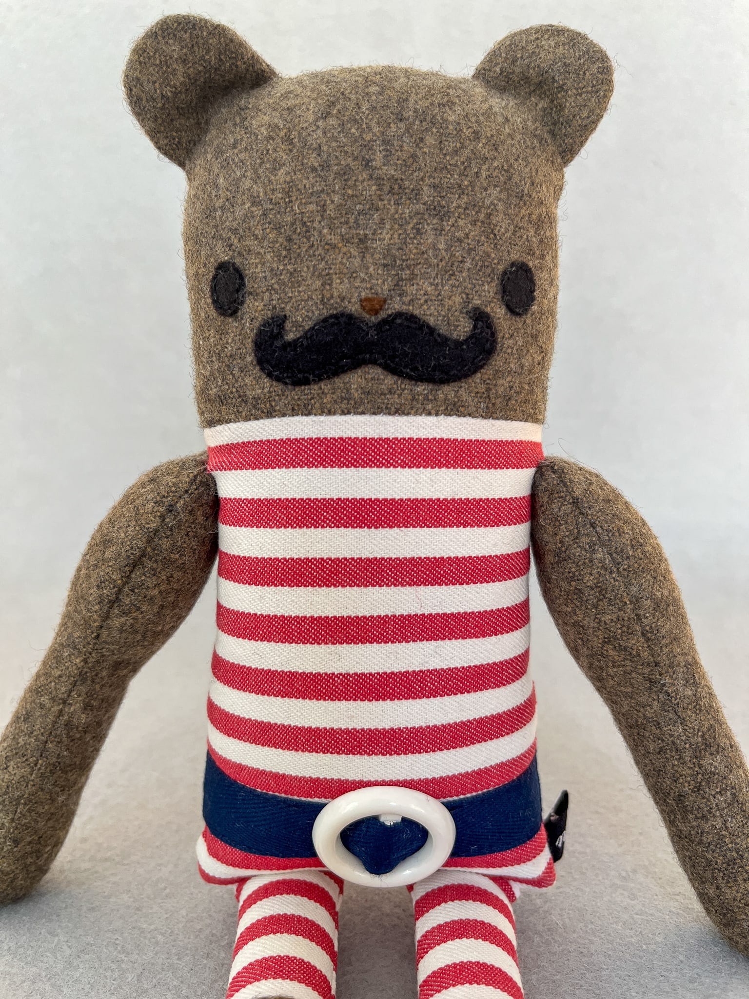 Der starke August Schurwollgemisch, Baumwolle, Wollmischfilz und einer Vintage-Plastikschnalle. In Form gebracht mit Füllwatte, die mit dem Öko-Tex Standard 100 zertifiziert ist. August ist ca. 32 cm groß und sein Gesicht und der eindrucksvolle Schnurbart sind von Hand appliziert.